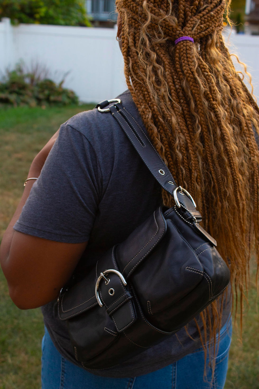 This project was inspired by an early 2000s Coach poster for their "This is a Coach bag" advertising campaign. It features their original 2004 black leather Soho flap-closure bag, which I second-hand purchased. I wanted to create my version of the campaign ad, incorporating the double stitching on the bag as the frame of the photo I selected from the photoshoot I did. I made it informational including the description of the bag below with the dimensions taken from Coach.com of the (Re)loved version of the bag I own.